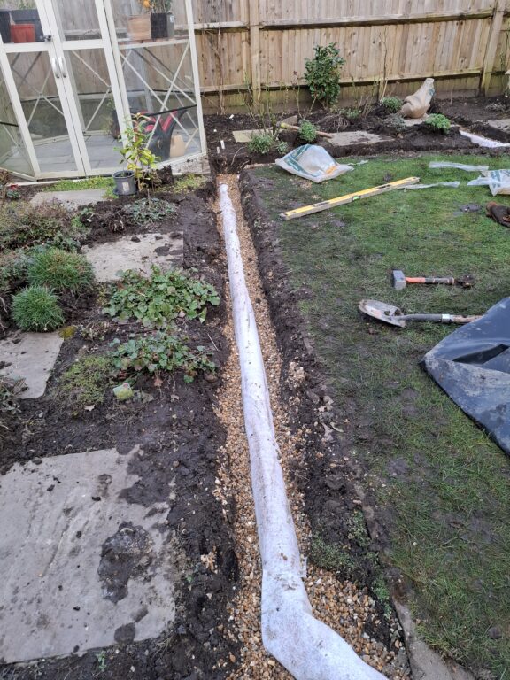 A French drain is a below-ground system designed to divert excess water away from your property. While various methods exist, our preferred approach involves installing a perforated pipe within a trench filled with shingle. The pipe is wrapped in a geotextile fabric to prevent soil from entering and clogging the system. Laid at a slight gradient, the pipe allows water to flow naturally downhill toward a soakaway, pond, or another appropriate drainage outlet.